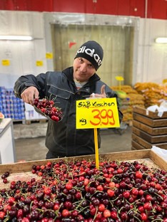 A destra: Azizi Shoheb, membro dello staff, mostra le ciliegie spagnole.