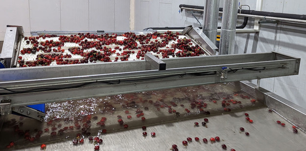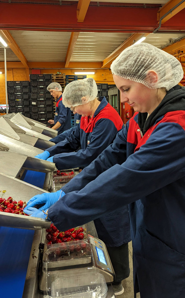 Quando i frutti entrano nella selezionatrice, la prima fase, l'hydrocooling, raffredda le ciliegie fino al cuore, bloccandone la maturazione e rendendole più sode. Passando attraverso l'acqua fredda e purificata, la loro durata di conservazione viene prolungata. Una volta separate con un separatore di piccioli, le ciliegie vengono fotografate da tutte le angolazioni con telecamere ottiche multispettrali. Le immagini vengono ispezionate per rilevare tutti i difetti esterni e alcuni interni, in modo da poter escludere i frutti danneggiati. "Queste telecamere sono in grado di rilevare una puntura di drosofila del giorno precedente, a volte invisibile a occhio nudo. Queste regolazioni certosine garantiscono una qualità impeccabile delle ciliegie".
