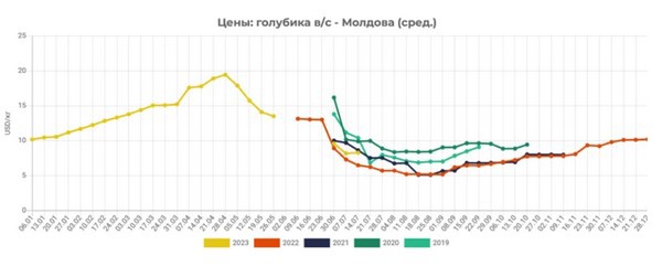 Non è esagerato dire che il mercato moldavo dei mirtilli è rimasto stagnante negli ultimi tre anni. Nel periodo 2018-2020, il livello dei prezzi all'ingrosso all'inizio della stagione (fine giugno-inizio luglio) per questo piccolo frutto di produzione locale era di 12,33-13,81 euro/kg, e a metà luglio non scendeva sotto gli 8,63 euro/kg, mentre nel periodo 2021-2023 i prezzi all'ingrosso dei mirtilli moldavi sono partiti da 8,38-8,88 euro/kg e sono scesi a 6,90-8,63 euro/kg in una o due settimane. Secondo EastFruit, il prezzo medio all'ingrosso dei mirtilli nel Paese è di 7,40-7,64 euro/kg.