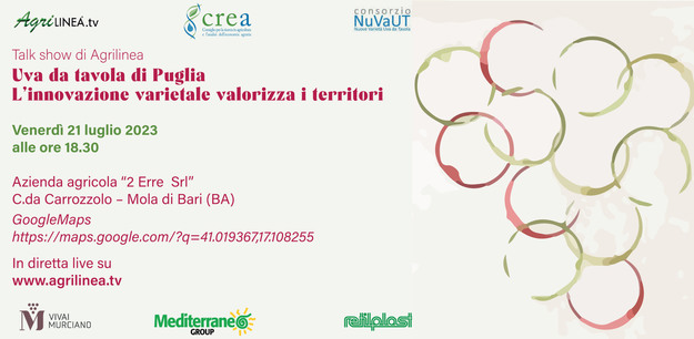 L'uva da tavola di Puglia di nuovo protagonista nel talk show di Agrilinea. L'appuntamento è venerdì 21 luglio alle ore 18:30 presso l'Azienda Agricola 2 Erre Srl in C.da Carrozzolo a Mola di Bari (clicca qui per le coordinate Google Maps), con il dibattito condotto da Sauro Angelini, con la collaborazione scientifica del CREA Viticoltura ed Enologia di Turi, e in partnership con il Consorzio Nu.Va.U.T., Vivai Murciano, Mediterraneo Group e Retilplast. La trasmissione andrà in diretta streaming su www.agrilinea.tv e sulla pagina Facebook. In seguito sarà pubblicata sul circuito televisivo di Agrilinea.