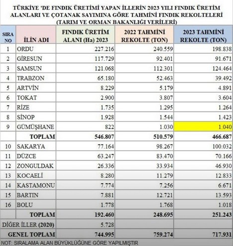 In Turchia 500mila famiglie vivono direttamente e indirettamente delle nocciole prodotte su 725mila ettari in 16 province. Nella Regione del Mar Nero, che costituisce l'importante potenziale del Paese nella produzione di nocciole, Ordu è in testa alla classifica come maggiore areale, con un noccioleto di circa 230mila ettari.