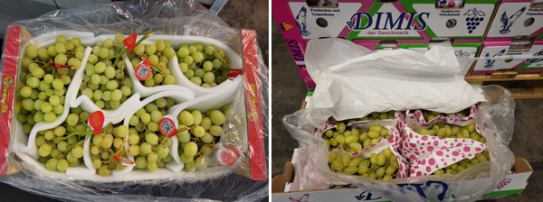 A sinistra: uve da tavola italiane, a destra: le prime uve da tavola greche Dimis di questa stagione