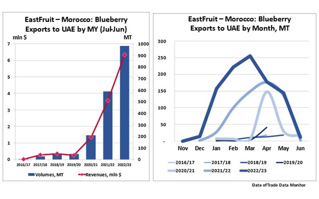 Nella campagna di commercializzazione 2020/21, il Marocco aveva spedito solo 211 ton di mirtilli al mercato degli Emirati Arabi Uniti. Successivamente, i volumi delle esportazioni sono triplicati e hanno raggiunto le 982 tonnellate per un valore di 6,3 milioni di dollari nella campagna di commercializzazione 2022/23.