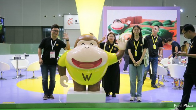La Guangdong Wanxin Agricultural Science and Technology Development Company con la mascotte dell'azienda. L'azienda non è solo importatrice di frutta, ma commercia anche frutta domestica, con particolare attenzione ai prodotti di Canton. Nella foto Rachel Wen, Hadi Chen, Fiona Li ed Erik Xian.