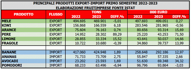 Parlando dei prodotti campioni dell'export italiano, scendono in zona negativa le esportazioni di mele (-5,01%) a fronte di un valore esportato praticamente costante, discorso diametralmente opposto per i kiwi che segnano un +6,18% in quantità e -0,56% in valore vedono ridurre il loro prezzo unitario di esportazione.