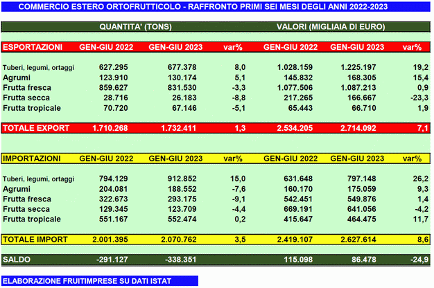 Per quanto riguarda le importazioni, a parte gli ortaggi, dei quali abbiamo già accennato, le quantità importate dei vari comparti segnano tutte segno negativo, recuperano in valore gli agrumi e la frutta tropicale, evidentemente per l'effetto dell'inflazione. Tirando le somme le importazioni nel settore ortofrutticolo crescono ancora del 3,5% in volume e dell'8,6% in valore.