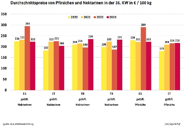 Tuttavia, si è potuto osservare anche un aumento delle quotazioni, innescato dalla riduzione dell'offerta. A Francoforte la frutta tedesca è stata ancora disponibile: i clienti hanno dovuto pagare 16 euro per confezione da 3,75 kg di pesche a polpa bianca e per confezione da 3,6 kg di pesche a polpa gialla. Anche le pesche rosse sono state commercializzate a 16 euro per cartone da 3,5 kg. Le pesche tabacchiere domestiche hanno avuto un costo di 3,20 euro/kg a Francoforte.