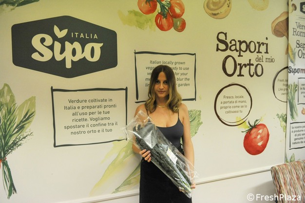 La referente commerciale mostra una confezione di cavolo nero