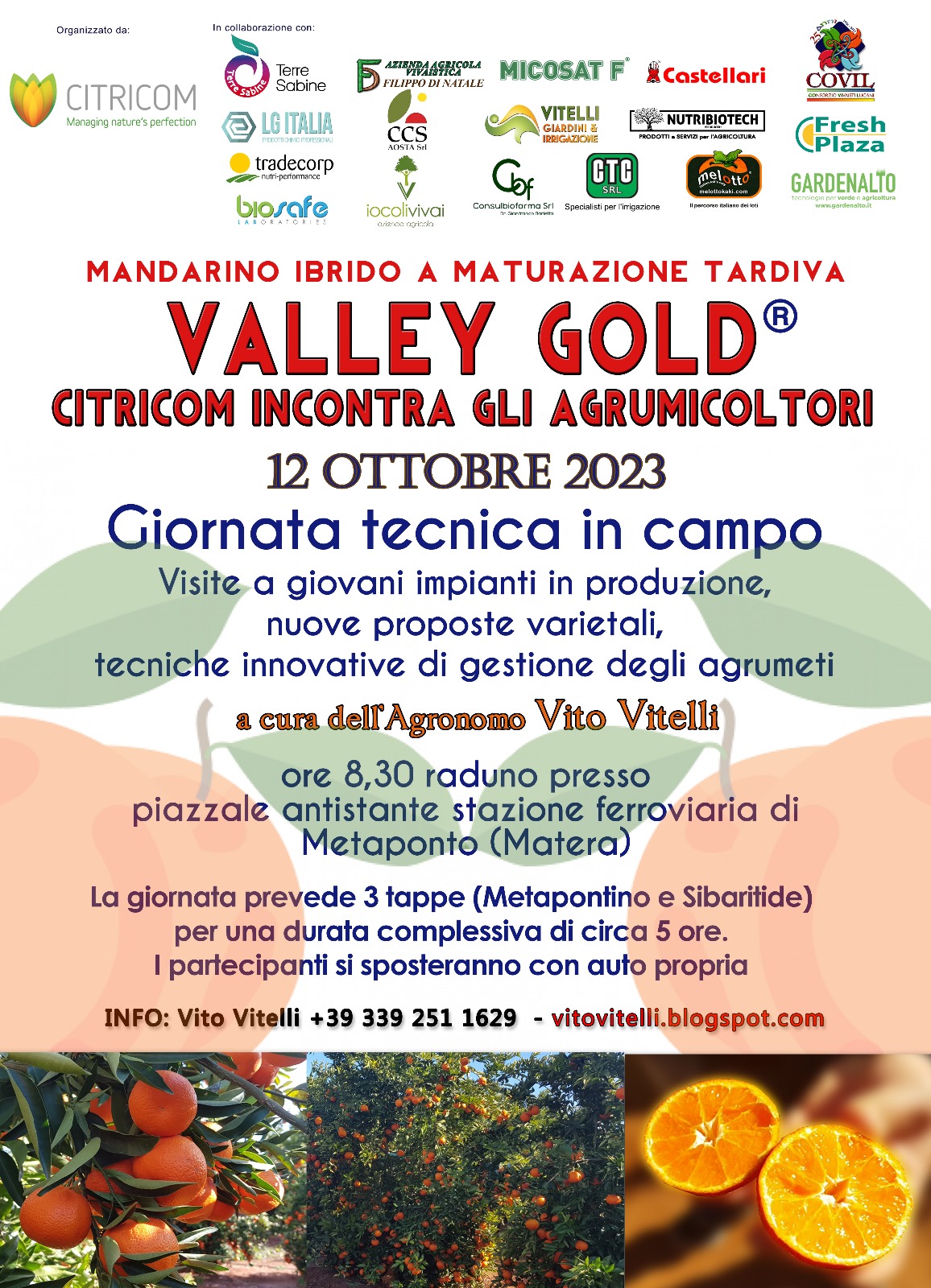 Dopo la nutrita partecipazione di pubblico avutasi lo scorso anno, giovedì 12 ottobre si terrà il secondo appuntamento con la visita ai giovani impianti in produzione di Valley Gold ubicati tra Basilicata, Puglia e Calabria, in occasione della quale ci saranno approfondimenti sulle tecniche innovative di gestione degli agrumeti, potatura, nutrizione, difesa dagli organismi nocivi e dalle fisiopatie e irrigazione. La mission dell'appuntamento è continuare a valutare le coltivazioni, l'attitudine e l'adattamento della varietà nei diversi areali a vocazione agrumicola del Sud Italia.