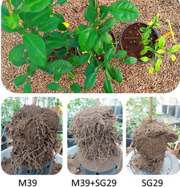 Immagini sopra: L’inoculazione dell’isolato antiCTV ottenuto dal progetto SIRPA (M39) non causa alcun sintomo in semenzali da arancio amaro sperimentalmente inoculati e li protegge dall’infezione con un isolato aggressivo prevalente in Sicilia (SG29). L’Inoculazione di SG29 in semenzali non protetti causa un marcato giallume, accorciamento degli internodi e foglie piccole e danneggiamento dell’apparato radicale.