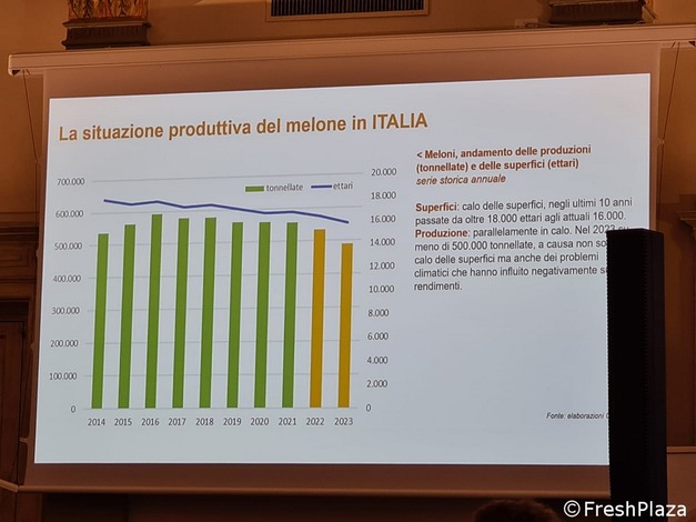 In Italia, dal 2014 al 2023 gli ettari di melone sono scesi da 18mila a 16mila. Nel 2023 si sono prodotte poco meno di 500mila tonnellate totali.