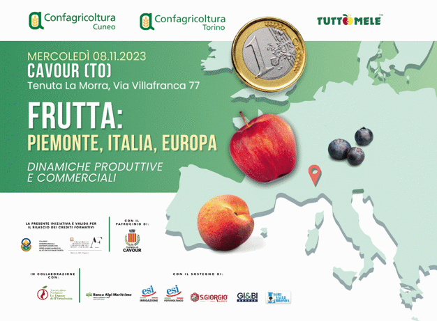 Ma proprio da una regione, il Piemonte (che vede il 36% del suo territorio vocato in generale alla produzione agricola, fonte Ires-Regione Piemonte), parte l'evento che tiene raccolti tutti questi elementi: a Cavour (provincia di Torino) si terrà infatti, mercoledì 8 novembre, all'interno dell'evento fieristico TuttoMele™, il convegno organizzato da Confagricoltura Cuneo e Confagricoltura Torino dal titolo "Frutta: Piemonte, Italia, Europa – Dinamiche produttive e commerciali", che vedrà susseguirsi interventi di importanti esponenti della filiera sia produttiva che distributiva e offrirà informazioni sui trend della produzione e sulle dinamiche legate alla vendita.