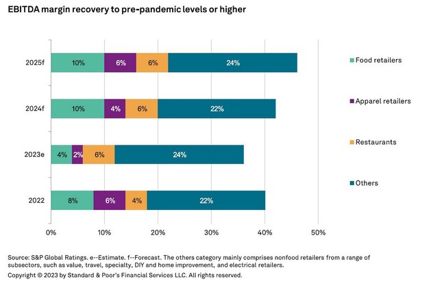 "Le nostre prove di stress su 50 retailer con rating che operano nei sotto-settori alimentare, casalingo, elettrico, fai-da-te e abbigliamento mostrano che un'ulteriore pressione sui loro margini EBITDA potrebbe erodere significativamente la loro qualità creditizia nel 2024 e 2025", ha dichiarato Raam Ratnam, credit analyst di S&P Global Ratings. Oltre la metà dei rivenditori europei oggetto di rating non sarà in grado di ripristinare i margini pre-pandemici entro il 2025.