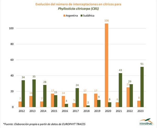 Con una lettera datata 3 ottobre 2023, Intercitrus ha avvertito la Commissione europea (CE) che il Sudafrica è sul punto di raggiungere un "numero record di intercettazioni" nei porti europei di agrumi colpiti da parassiti o malattie, il cui controllo è regolamentato come ‘prioritario’ da parte dell'Ue, come nel caso della macchia nera degli agrumi (CBS).