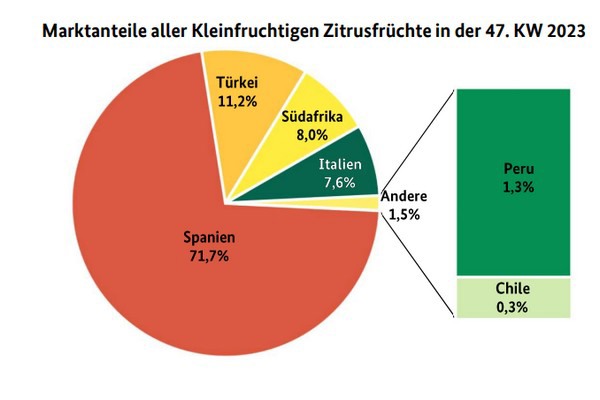 A Francoforte sono arrivati i primi lotti marocchini, ma non hanno suscitato quasi alcun interesse. Nella settimana 48, ad Amburgo sono previste anche delle consegne dal Marocco. I mandarini provenienti da Sudafrica, Perù e Cile hanno continuato a essere presenti sul mercato. Tuttavia, la loro importanza è diminuita e i prezzi sono risultati tendenzialmente in calo, anziché aumentare man mano che la domanda dei clienti si indeboliva.