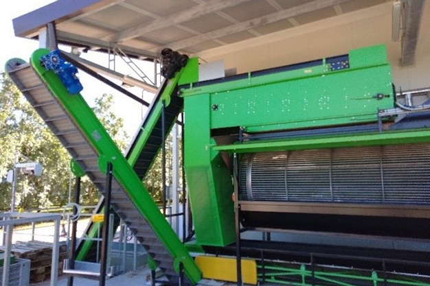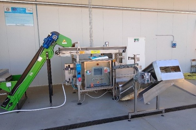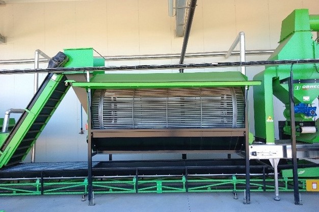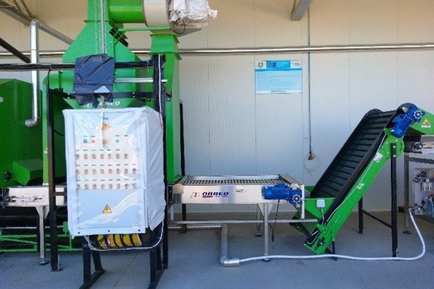La macchina pulisce e seleziona le noci in arrivo dalla campagna, preparandole per la successiva fase di essiccazione, utilizzando significative quantità di acqua (circa 10 m3/h) che vengono poi scaricate in un laghetto artificiale. All'interno del laghetto le acque subiscono un processo di decantazione: sul fondo si depositano i materiali solidi mentre l'acqua viene periodicamente inviata nella fognatura pubblica mediante un sistema di pompaggio dotato di aspirazione galleggiante. I solidi che si depositano sul fondo vengono rimossi meccanicamente a fine campagna.