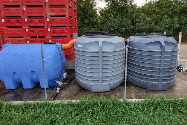 Le acque reflue prodotte dalla macchina utilizzata per il lavaggio delle noci sono convogliate in un nuovo pozzetto di raccolta all'interno del quale è installata una pompa sommersa per il rilancio dell'acqua stessa al successivo impianto. Le acque destinate al riutilizzo vengono preliminarmente trattate all'interno di un sistema statico di dissabbiatura e degrassatura (realizzato con serbatoi in materiale plastico posizionati fuori terra) al fine di eliminare tutti i solidi grossolani, sia sedimentabili che galleggianti.