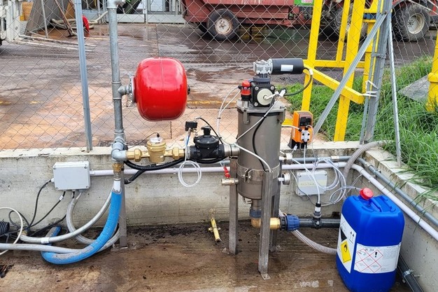 Per il controlavaggio si utilizza la stessa acqua contenuta nel serbatoio di polmonazione. Durante l'attività di controlavaggio, l'alimentazione di acqua alla macchina Obreo viene garantita da un sistema di autoclavi poste a valle del filtro. L'acqua reflua prodotta nel controlavaggio viene scaricata direttamente nel laghetto. L'acqua filtrata, dopo opportuna additivazione proporzionale di acqua ossigenata, viene riutilizzata nei primi settori della stessa macchina Obreo. Per il dosaggio del prodotto disinfettante si utilizza una pompa dosatrice elettromagnetica asservita a un misuratore di portata lancia impulsi. La concentrazione di disinfettante può essere monitorata con kit analitico manuale.