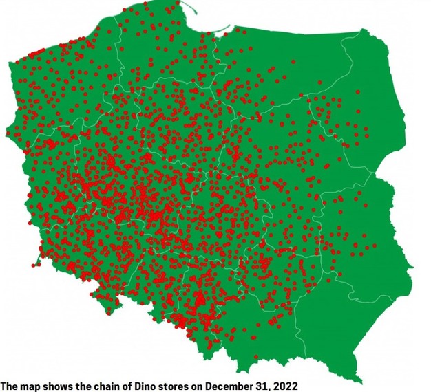 Dino genera attualmente il 100% del suo fatturato in Polonia. Il mercato polacco è molto interessante. Dino Polska potrebbe ancora costruire e gestire 9.000 supermercati prima di raggiungere la saturazione entro il 2031.