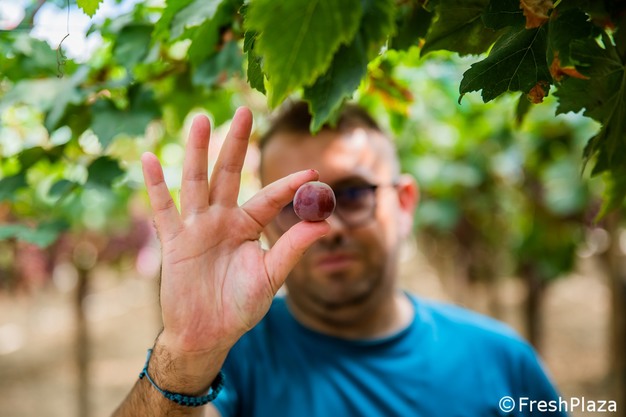 Morreale mostra un chicco d'uva rosso. Se d'inverno il core business è il pomodoro, d'estate è l'uva da tavola. (Clicca qui per vedere la galleria fotografica intera)