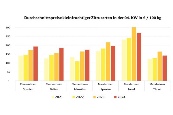 L'importanza dei mandarini è evidentemente cresciuta sui mercati tedeschi: oltre alle varietà spagnole Clemenvilla, Clemenova e Tango, è arrivata anche la Nadorcott. Le offerte dalla Spagna non sono state sempre convincenti a livello di qualità, con conseguenti occasionali riduzioni di prezzo. L'israeliano Orri non ha invece avuto problemi di qualità, e questo ha portato ad aumenti di prezzo, dovuti anche al miglioramento delle opzioni di stoccaggio. La varietà di mandarino Nadorcott è stata consegnata principalmente dalla Turchia, e la Murcott si è aggiunta alla gamma. La Nadorcott è arrivata anche dal Marocco. L'Italia ha fornito alcuni lotti: il calibro 1xx Mandared è costato 20 euro per confezione da 6 kg a Francoforte, ed è stato venduto rapidamente grazie alle sue interessanti proprietà organolettiche. I primi mandarini Orri spagnoli dovrebbero essere arrivati nella settimana 5.