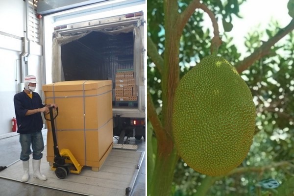A sinistra: carico all'origine, a destra: Jackfruit sull'albero.