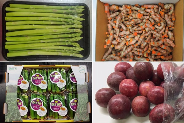 Alcuni esempi dell'assortimento di Körner Agro. In senso orario: asparagi verdi, curcuma, frutti della passione di Tainong e gombo. La stagione dei frutti della passione si sta lentamente concludendo. A partire da aprile l'azienda inizierà gradualmente a produrre rambutan e mangostano.