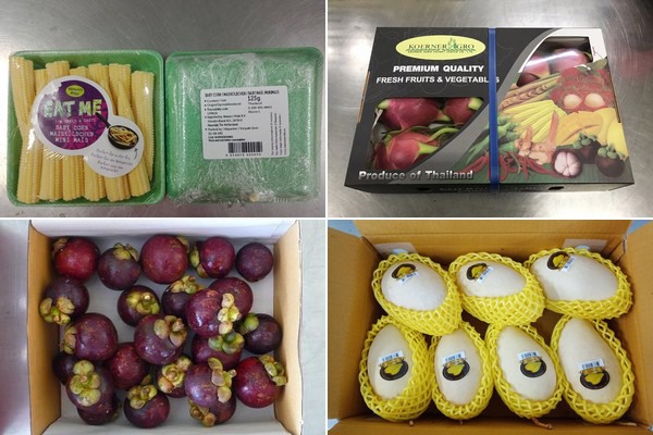Prodotti ortofrutticoli thailandesi. In senso orario: Mais baby, Pitahaya o frutto del drago, mango Nam Dok Mai e mangostano.