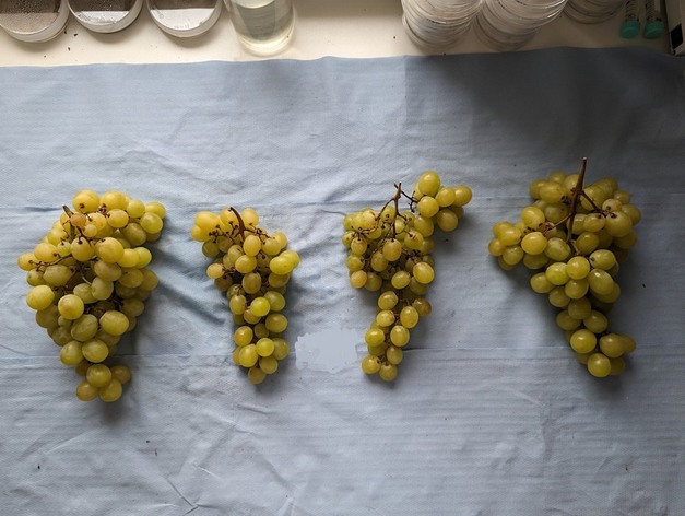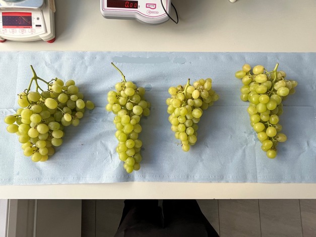 Il colore dell'uva è un importante indicatore di maturazione. Le diverse varietà di uva cambiano colore durante la maturazione. La raccolta al giusto stadio di colore assicura che le uve siano completamente sviluppate e pronte per il consumo. Le alte temperature possono causare scottature e disidratazione sul lato direttamente esposto alla luce. Ciò può influire anche sull'aspetto del rachide e degli acini circostanti, causando decolorazioni o sovracolorazioni e compromettendo potenzialmente la qualità complessiva del grappolo (fig. 2).