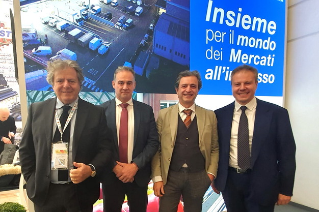 Da sinistra: Gianni Indino (presidente CAAR - Centro Agroalimentare Rimini), Alessandro Giunchi (presidente Filiera Ortofrutticola Romagnola - Mercato Ortofrutticolo di Cesena), Marco Core (presidente CAL - Centro Agroalimentare e Logistica Parma), Marco Marcatili (presidente CAAB - Centro AgroAlimentare di Bologna). I 4 centri agroalimentari fanno parte della Rete Mercati Emilia-Romagna