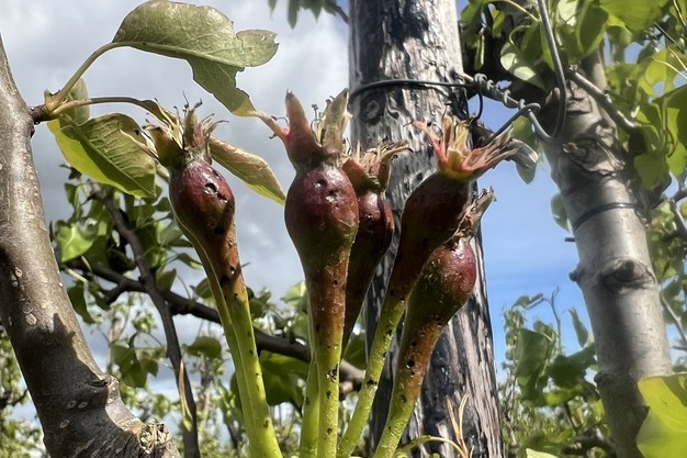 "Ma dipende anche da quali saranno le condizioni meteorologiche nei prossimi mesi. Si può paragonare a un graffio sulla mano. Se continua a sporcarsi e a bagnarsi, non guarirà. Ma se il sole inizia a splendere su di esso, la guarigione è molto più rapida. Lo stesso vale per le pere Conference. Sono un po' meno ottimista per altre varietà, come Xenia, Lukassen e Comice. Temo che le loro macchie rimarranno visibili o si trasformeranno in protuberanze. Soprattutto perché queste varietà sono più sensibili. La fioritura precoce implica che le pere erano già grandi come il 9 maggio dell'anno scorso. Possiamo solo aspettare e vedere cosa succederà", spiega Wim.