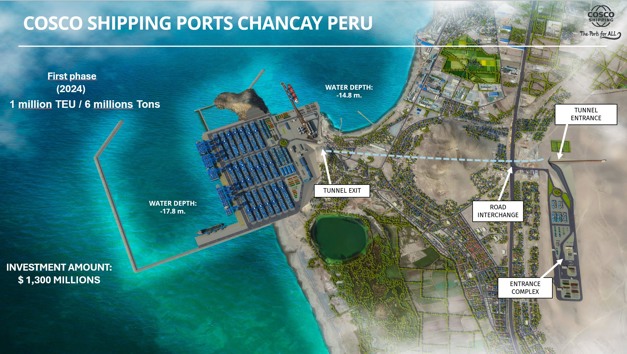 Il servizio WSA3, da vari porti della Cina a quelli di Messico, Perù e Cile, sposterà la sua attuale fermata dal porto di Callao al porto di Chancay. A questo si aggiungerà un nuovo servizio diretto tra il porto di Chancay e il porto di Shanghai con un arrivo a settimana. Il progetto, concepito nel 2009, è stato avviato nel 2018 e comporterà un investimento di circa 3,6 miliardi di dollari per il totale delle quattro fasi.