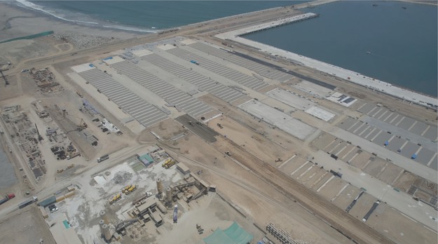 Il porto di Chancay nella sua prima fase: a sinistra il terminal per le rinfuse, al centro due terminal per le navi portacontainer e a destra il terminal per le navi reefer e da pesca