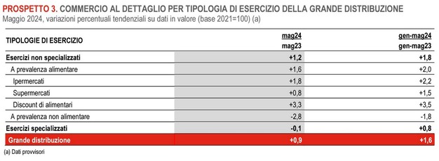 Rispetto a maggio 2023, il valore delle vendite al dettaglio è in aumento per la Grande distribuzione (+0,9%) e le imprese operanti su piccole superfici (+0,2%), mentre è in calo per le vendite al di fuori dei negozi (-1,6%) e il commercio elettronico (-1,4%).