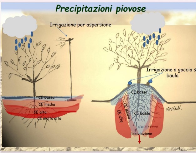 "Le Irrigazioni frequenti e di bassa portata aiutano a contenere la presenza di cloruro di sodio, creando un effetto dilavante, accentuato poi da specifici prodotti "dissalatori". Quando poi finalmente pioverà, i sali tenderanno a scendere verso il basso, non danneggiando così l'apparato radicale".