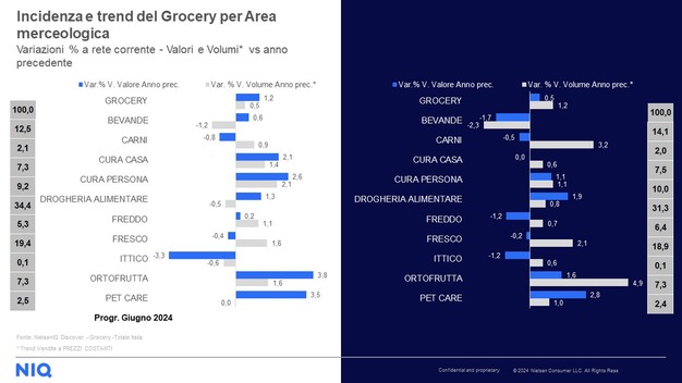 Tenendo presente il rapporto tra valori e volumi a totale Italia omnichannel, nel comparto grocery, a giugno l'indagine evidenzia un trend in crescita a valore del +0,5% (vs 2023) e una risalita dei volumi pari al +1,2%. Per quanto riguarda il fresco (peso fisso + peso variabile) risulta in crescita in tutti i canali distributivi, a eccezione degli iper>4500 (-2,2%) e dei liberi servizi (-2,3%).