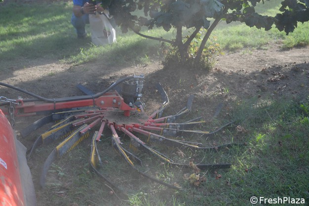 L'azienda Sirri ha acquistato un'attrezzatura, portata anteriormente, per la raccolta. "Si tratta di una spazzola anteriore che convoglia le nocciole ad una coclea e queste vengono poi aspirate e trasferite sul bins portato posteriormente" spiega Babini.