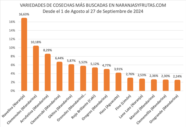Con l'obiettivo di condividere con il settore le tendenze di ricerca dei rivenditori per le colture disponibili, Juan José Bas, direttore di Naranjasyfrutas.com spiega: "Abbiamo stilato una lista delle 14 varietà più ricercate dal 1° agosto al 27 settembre 2024. I risultati ottenuti per varietà sono, in ordine: Navelina, Clemenules, Arrufatina, Clemenrubí, Okitsu, Oronules, Rojo Brillante, Orogros, Hass, Fino, Lane Late, Marisol, Clemenvilla e Orogrande".