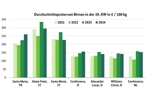 Sul mercato tedesco prevalgono le pere turche della varietà Santa Maria. Seguono per importanza le Santa Maria italiane e le Abate Fetel, oltre alle Conference nazionali. La Germania ha offerto anche Alexander Lukas, Williams Christ e Xenia. L'Italia ha completato la gamma con Williams Christ e Carmen, i Paesi Bassi con Conference e Xenia di grande calibro. Mentre la domanda per la più costosa Conference dai Paesi Bassi è stata limitata a Monaco, la Santa Maria turca è stata venduta costantemente e a prezzi stabili, secondo BLE.
