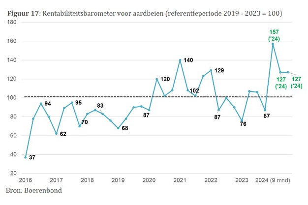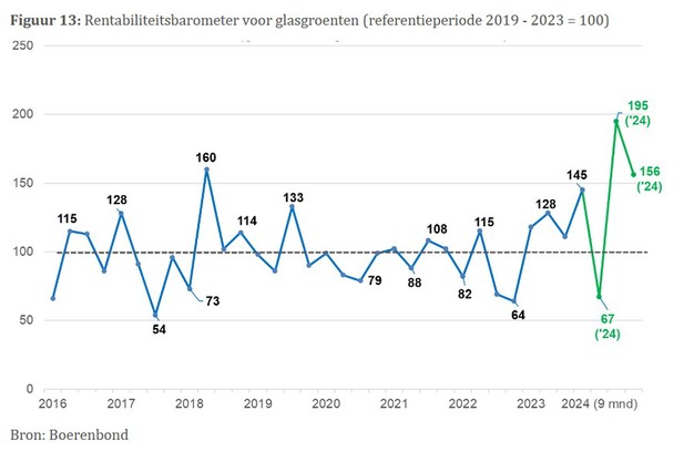 La redditività per gli ortaggi in serra è rimbalzata dopo un primo trimestre insoddisfacente. Nei primi tre mesi del 2024, l'indice di redditività per gli ortaggi in serra è sceso notevolmente a causa di forti cali di prezzo per tutti i prodotti nel paniere, ovvero lattuga (-39%), cetrioli (-35%), pomodori (-32%) e peperoni (-19%). La spiegazione è la fornitura significativamente maggiore di queste verdure dai Paesi del sud, tra cui il Marocco. La fornitura di pomodori è stata maggiore anche in Belgio, grazie a prezzi dell'energia più favorevoli.