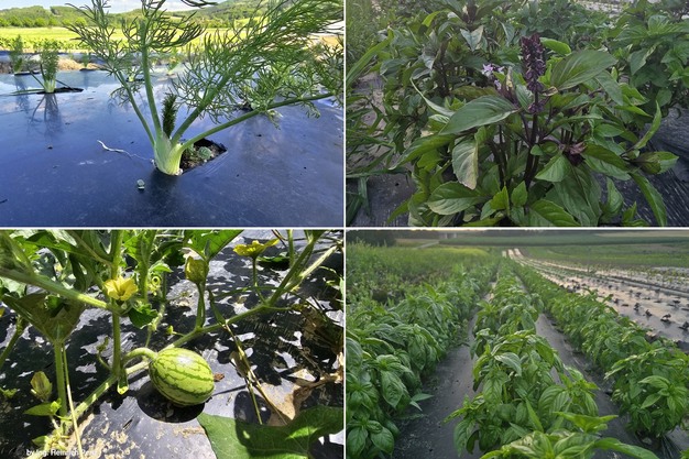 La maggior parte delle colture di produzione propria viene piantata su film pacciamanti biodegrabili. In senso orario: finocchio, cannella, basilico genovese e anguria.