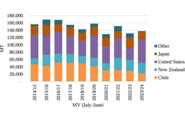 Taiwan importa oltre 135mila tonnellate di mele all'anno, con un'offerta interna inferiore all'1%. Il dipartimento dell'agricoltura degli Stati Uniti (Usda) prevede che nella campagna 2024/25 le importazioni di mele di Taiwan torneranno a 145mila tonnellate, con un'offerta interna stabile a 1.250 tonnellate. Gli Stati Uniti e la Nuova Zelanda sono i principali fornitori, seguiti da Giappone e Cile. Nella campagna 2023/24 gli Stati Uniti hanno guadagnato una quota di mercato del 46% (64.694 tonnellate), in gran parte a causa della temporanea sospensione delle esportazioni sudafricane dovuta a una quarantena per la tignola del melo, e al fatto che le mele americane continuano a essere competitive in termini di prezzo.