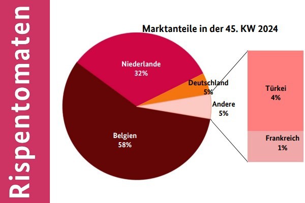 Nella settimana 45 del 2024, i pomodori a grappolo sono arrivati sul mercato tedesco principalmente dai Paesi Bassi e dal Belgio, integrati da prodotti nazionali e turchi. I pomodori tondi provenivano principalmente dal Marocco e dal Belgio, mentre le importazioni turche sono state inferiori in termini di quantità. I pomodori ciliegino sono stati forniti prevalentemente dai Paesi Bassi e dall'Italia. Secondo il BLE, quasi tutti i pomodori insalatari disponibili provenivano dal Belgio. Le forniture spagnole sono state piuttosto limitate ad Amburgo. In generale, la domanda si è potuta soddisfare senza difficoltà. Ad Amburgo le condizioni dei lotti marocchini si sono indebolite, il che significa che è stato possibile venderli solo a prezzi più bassi. A Monaco e Berlino le offerte di pomodori turchi hanno subito la stessa sorte, con una sospensione degli scambi a partire da metà settimana. A Colonia si sono registrati aumenti di prezzo quasi generalizzati, e solo i pomodori ciliegino olandesi hanno subito una leggera riduzione di prezzo.