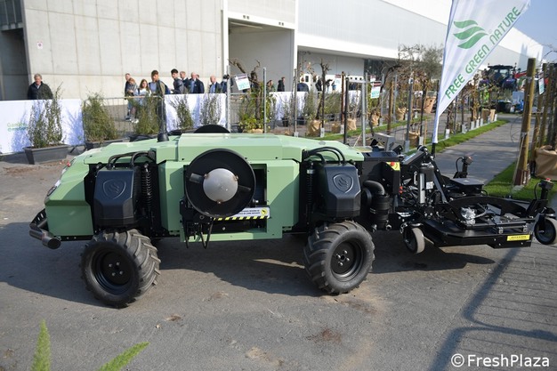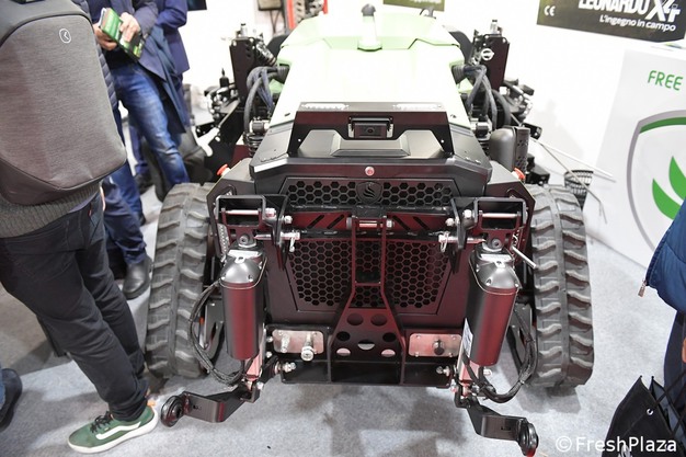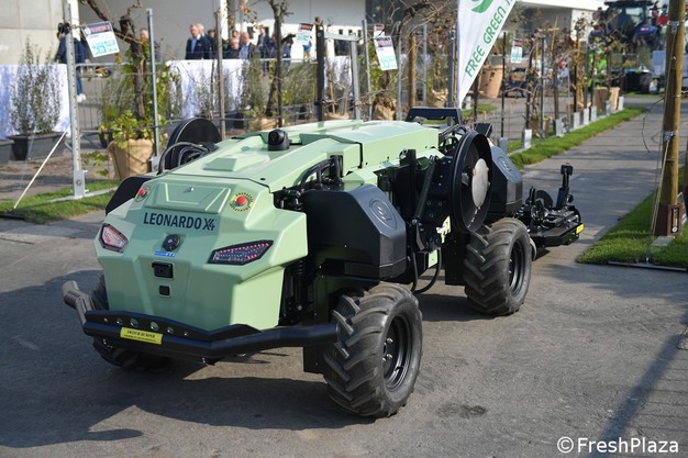 In fiera, nell'area esterna, il robot Leonardo ha dato dimostrazione di quello che sa fare. "È dotato di un motore ibrido, così da non fermarsi mai. Copre comodamente 15 ettari di superficie. La versione a ruote è già stata venduta a diverse aziende, quella a cingoli la presentiamo ora", ha precisato Balliana.