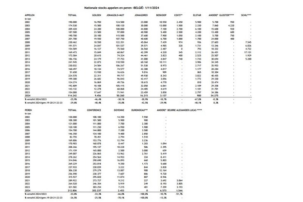 Una situazione simile si verifica con le mele. "Al 1° novembre, le scorte di mele erano inferiori di un terzo rispetto all'anno scorso, ma grazie ai calibri più grandi, abbiamo finito per raccogliere il 20% in più rispetto alle previsioni di agosto", spiega Tony. "Il calibro principale è 85/90, che spiega i volumi in più. Per quanto riguarda la Jonagold, il 1° novembre erano in magazzino oltre 50.000 tonnellate, con un calo del 30% rispetto all'anno scorso. Per altre varietà, come Jonagored, le scorte superano le 16.000 tonnellate (-31%), mentre le mele Golden sono scese a poco più di 9.000 tonnellate (-46%)".