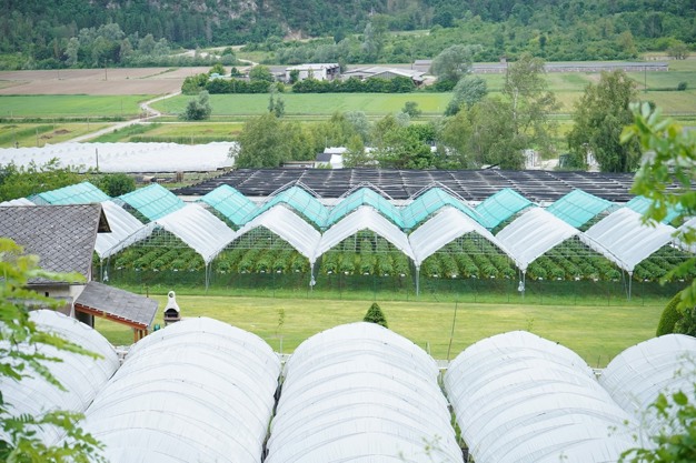 Si tratta di una novità assoluta in Italia: una serra coperta da particolari teli verdi, mimetizzata nel paesaggio circostante, ombreggiata. Adatta a contrastare le temperature crescenti.