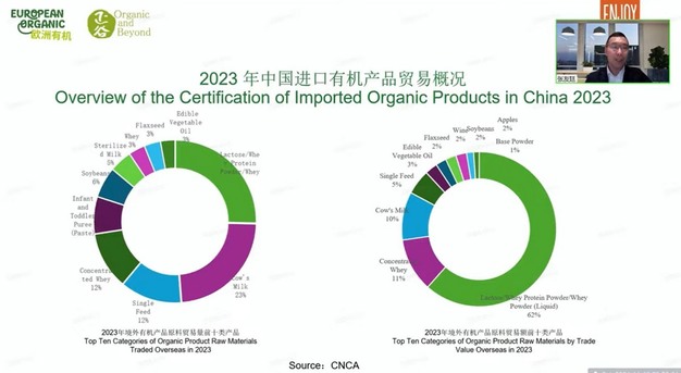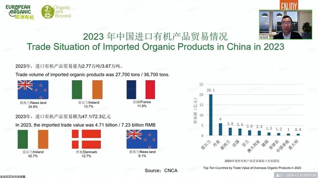 Per quanto riguarda l'importazione di prodotti biologici in Cina, ci sono due aspetti principali da considerare, secondo Youting: il volume e il valore commerciale. Nel 2023, i prodotti biologici importati in Cina hanno registrato circa 27.700 tonnellate, mentre quelli esportati dalla Cina sono stati di 36.700 tonnellate. I principali Paesi da cui la Cina importa sono la Nuova Zelanda (25%), l'Irlanda (13,7%) e la Francia (11,9%). Il valore commerciale delle importazioni biologiche nel 2023 è stato di 4,71 miliardi di yuan, mentre quello delle esportazioni è stato di 7,23 miliardi di yuan. I principali Paesi verso cui la Cina esporta includono l'Irlanda (42,7%), la Danimarca (12,7%) e la Nuova Zelanda (8,1%).