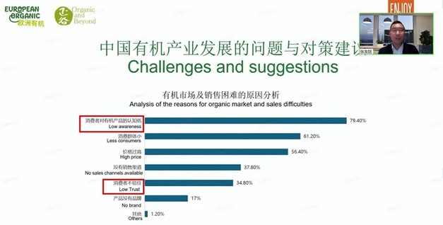 La consapevolezza dei consumatori cinesi riguardo ai prodotti biologici è piuttosto bassa. Un'indagine del CNCA (l'ente cinese per la certificazione) ha rivelato che solo l'11% dei consumatori cinesi conosce bene l'etichetta biologica, l'85% ne sa poco, e il resto non sa cosa sia. "Tale livello di conoscenza è molto inferiore rispetto a quello di alcuni Paesi europei. Inoltre, in Cina, chi compra prodotti biologici è spesso parte di un gruppo ristretto di persone ad alto reddito, che vivono nelle grandi città sviluppate, e rappresentano solo una piccola frazione della popolazione totale", ha sottolineato Youting.