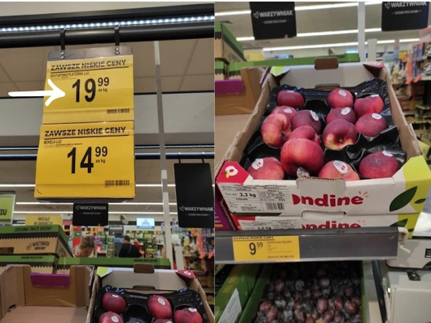 Nella foto scattata quest'estate si possono vedere le nettarine italiane prodotte da Alegra sullo scaffale del leader di mercato discount Biedronka al prezzo di 4,78 euro al kg.