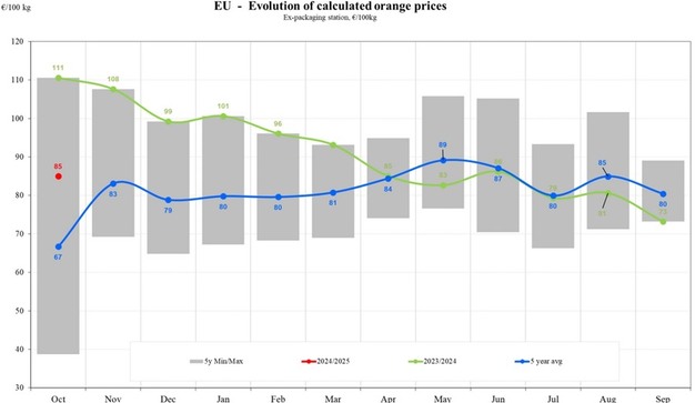 Il mercato agrumicolo dell'Unione europea (Ue) ha mostrato variazioni di prezzo differenti tra gli Stati membri, riflettendo sia le sfide regionali sia le condizioni di mercato più ampie. A ottobre 2024, il prezzo medio Ue per le arance era di 85 euro/100 kg, con un aumento del 16,08% rispetto a settembre, ma un calo significativo del 26,26% rispetto a ottobre 2023. Questa disparità sottolinea un contesto di prezzi complesso guidato da fattori di domanda e offerta in continua evoluzione.